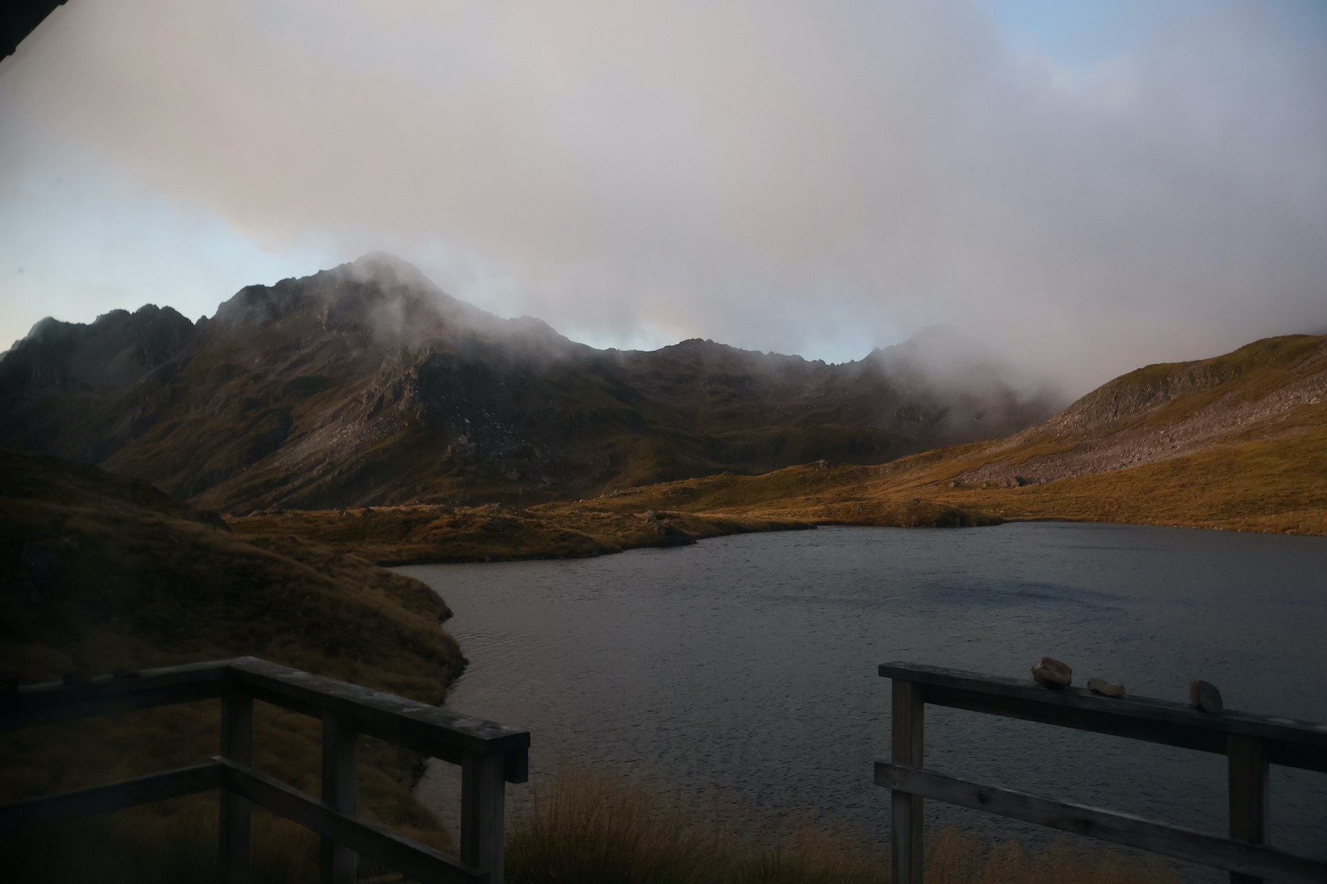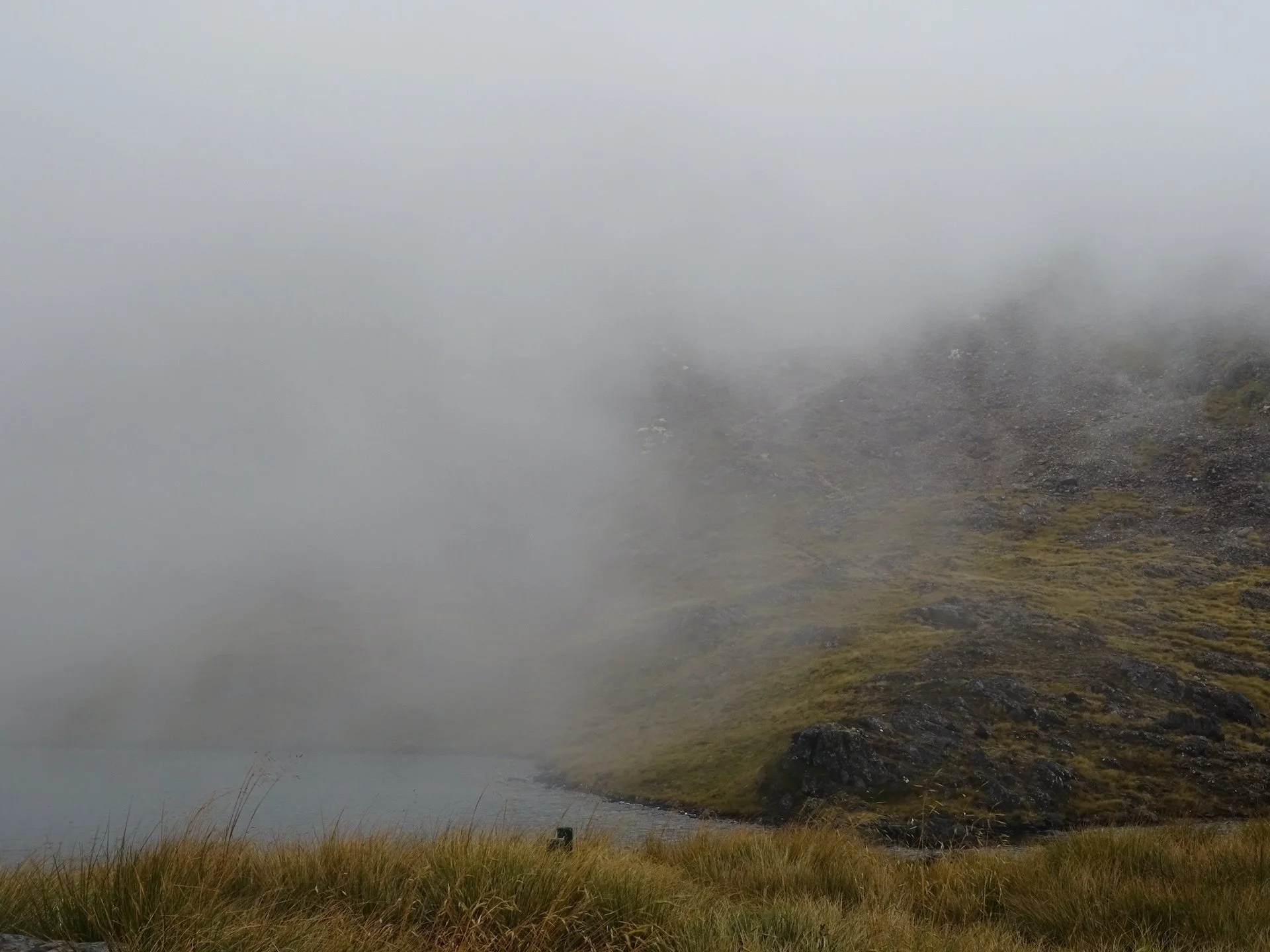 The second day of our tramp- ruthless incline through the bush, ruthless speargrass cutting our legs, ruthless boulders just itching to roll our ankles, ruthless wind across the ridge, and ruthless rain pelting our faces. We topped the summit with a view that we’d never seen before…